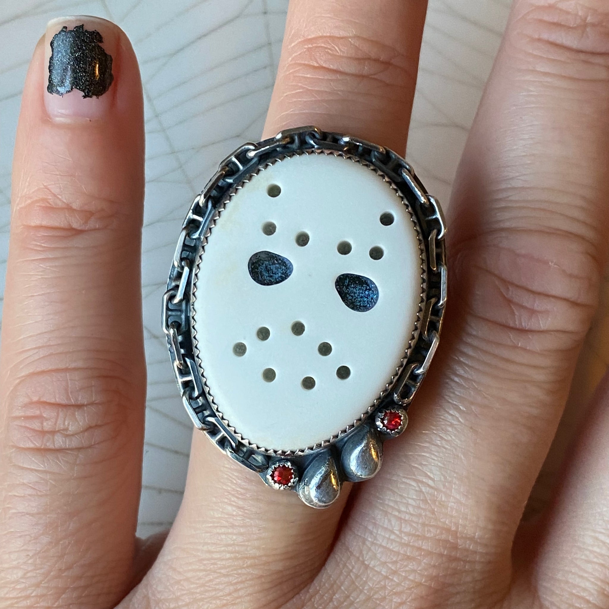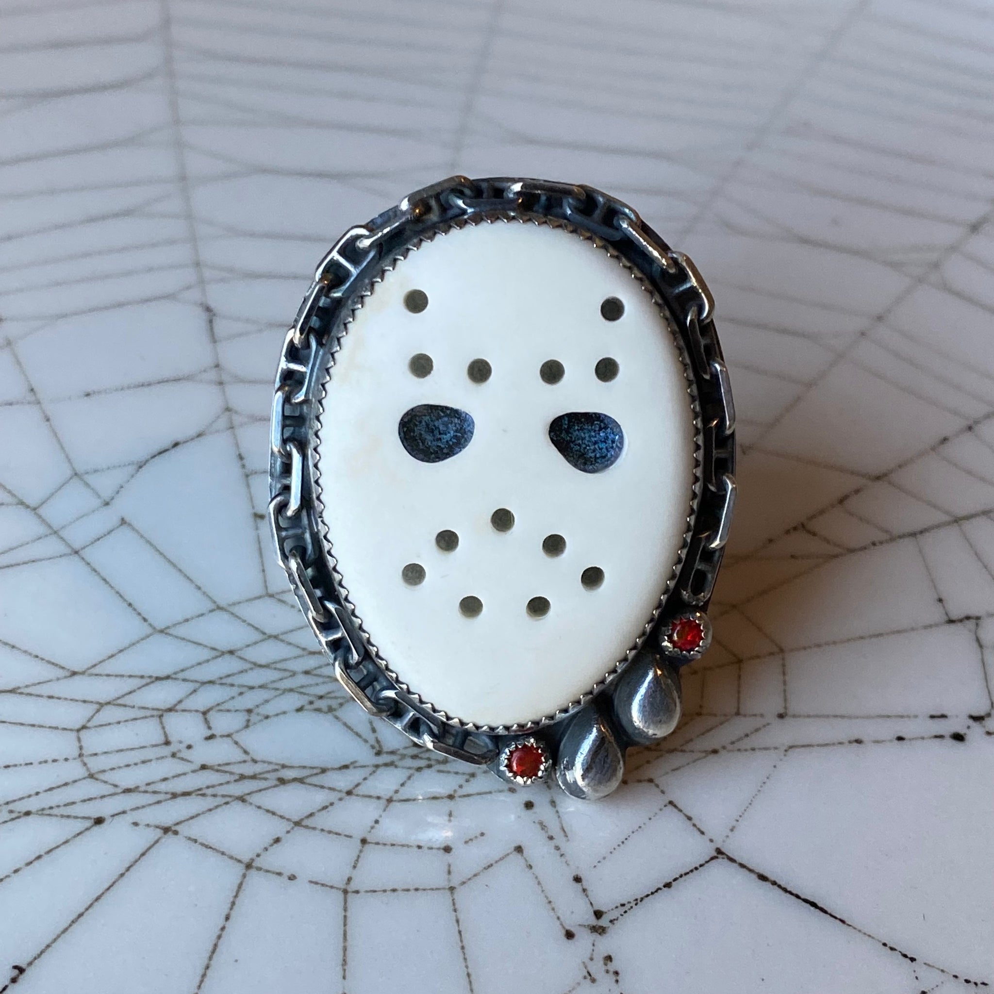 Friday the 13th Jason Mask Statement ring. Howelite carved Jason mask with red synthetic opals. Solid sterling silver with double ring band that fits a size 7.5.