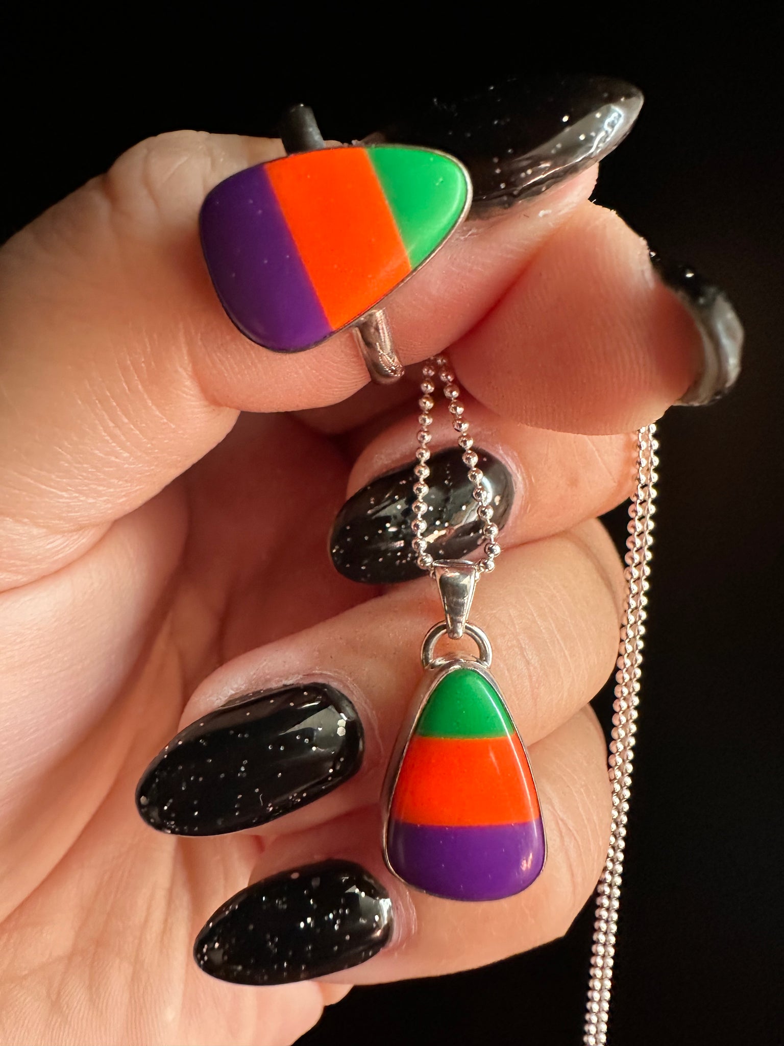 Solid Sterling Silver Ring featuring a billiard candy corn. 18 inch chain