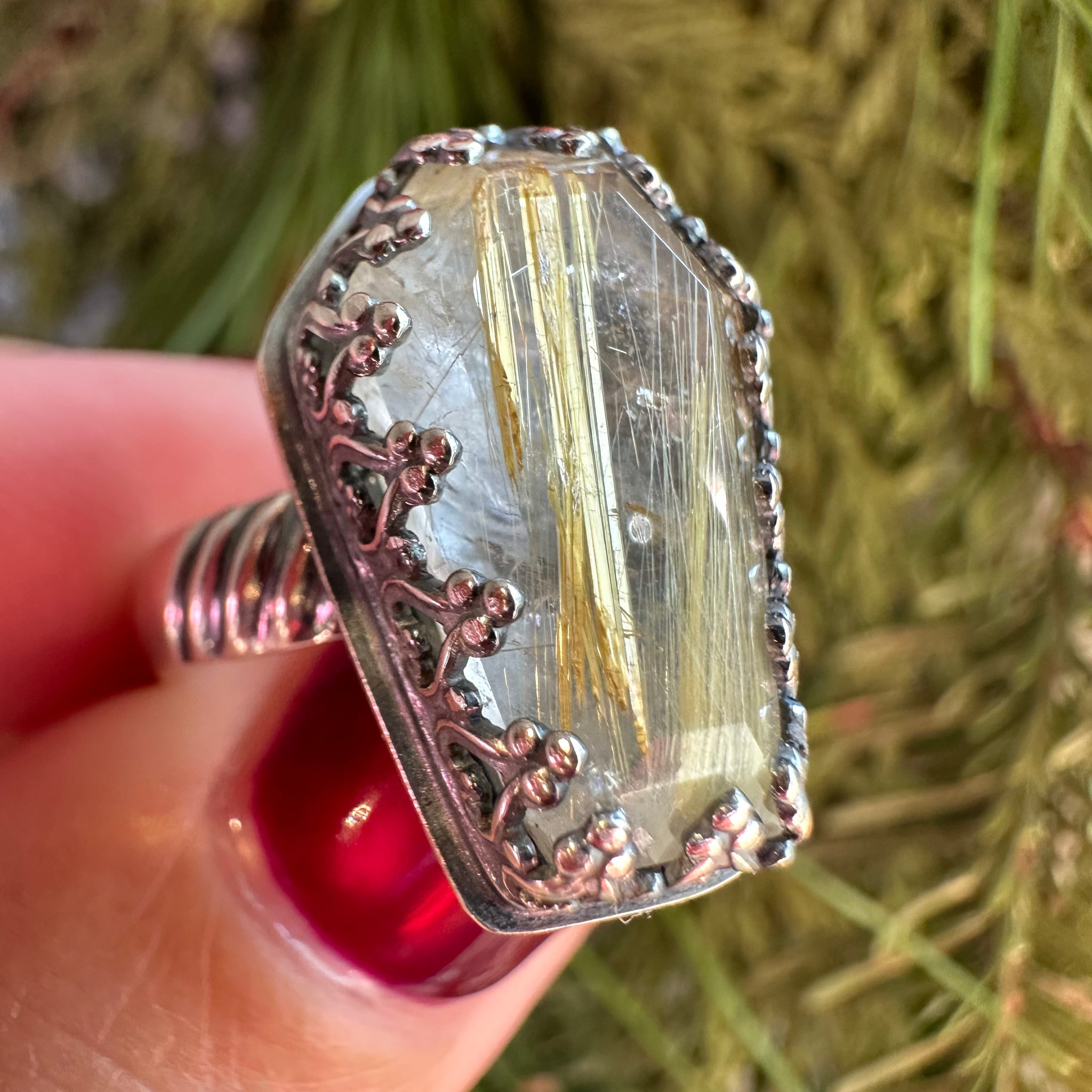 Gold rutilated quartz coffin set in solid sterling silver. Fits a ring size 7.5