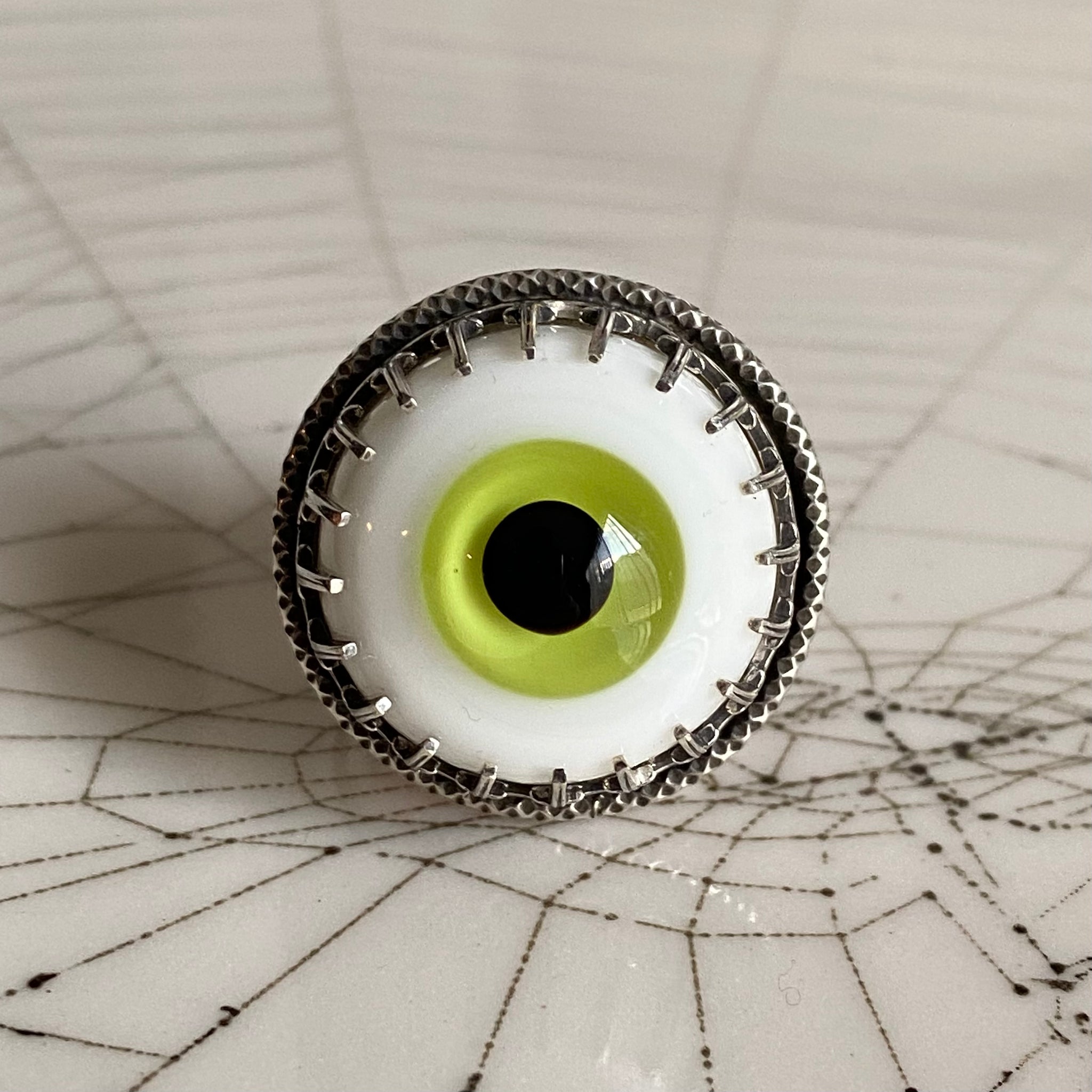 Bright Green Glass Eyeball Ring. Solid Sterling silver. Wide fancy band fits a ring size 7