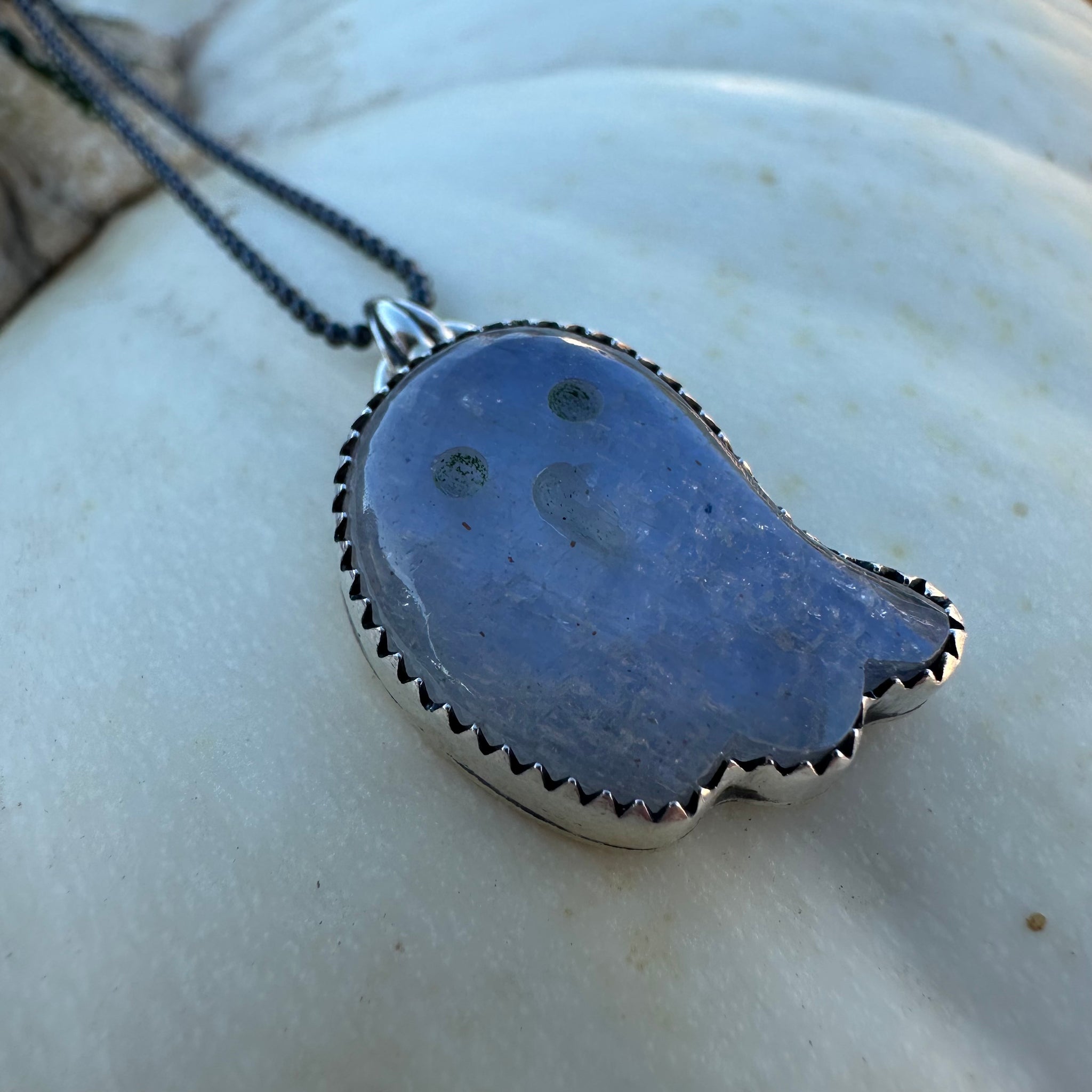 Solid Sterling Silver Necklace made with Rainbow Moonstone Ghost. 18 inch darkened silver bead chain. “BOO” hand stamped on the back.