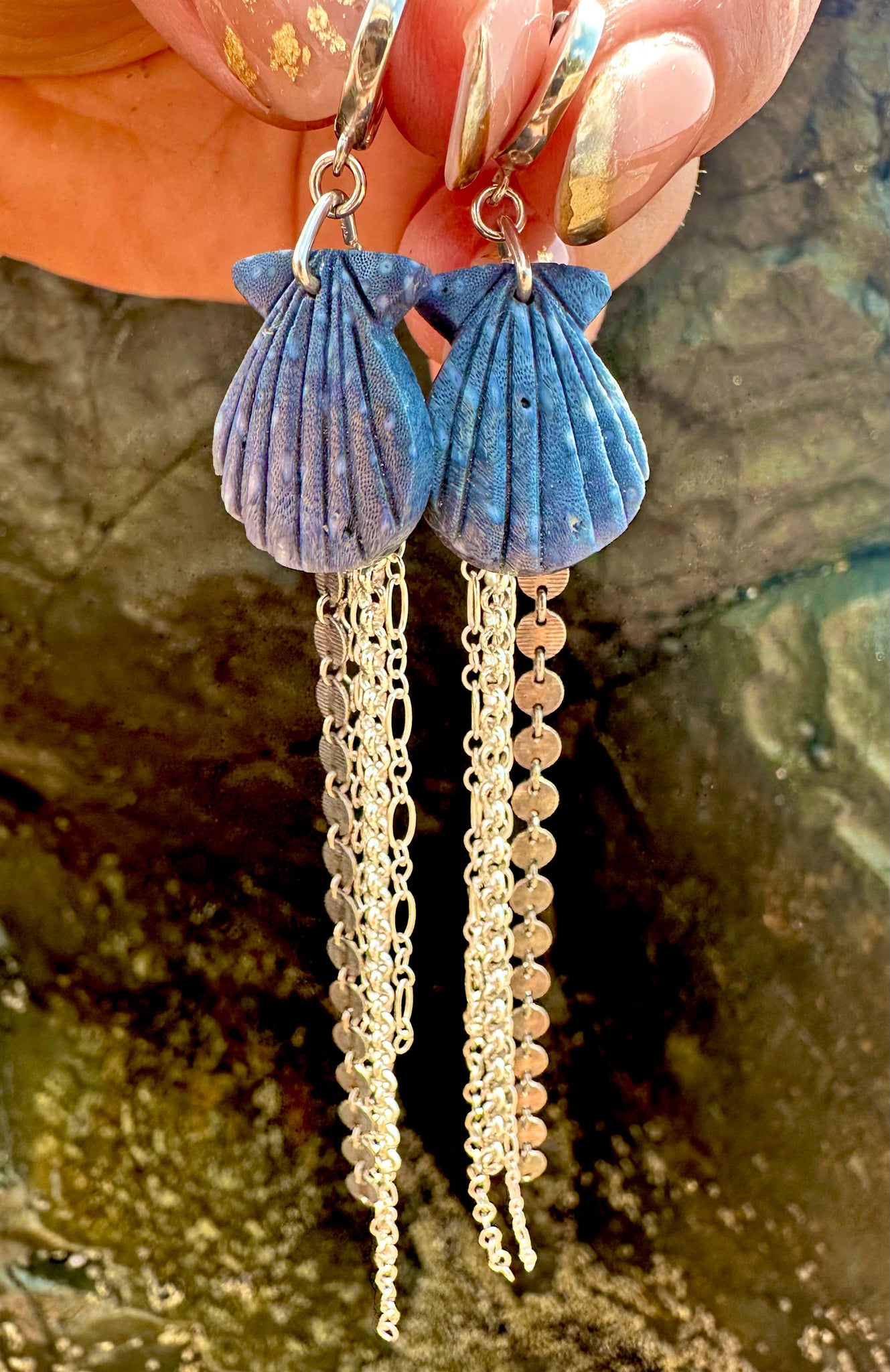 Carved blue coral shells with sterling silver huggie hoops and mixed fringe chain.