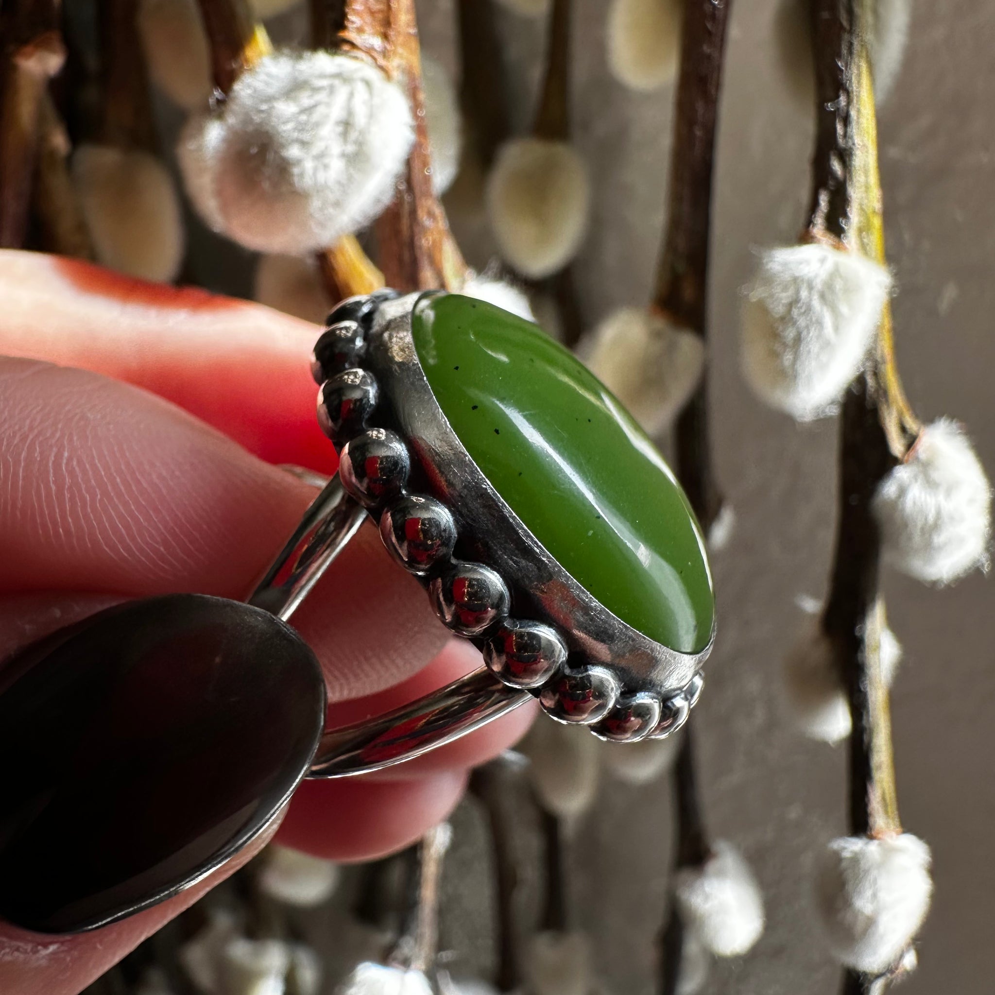 Solid Sterling Silver Ring featuring an Opaque Serpentine gemstone with a double band that fits a ring size 7.5