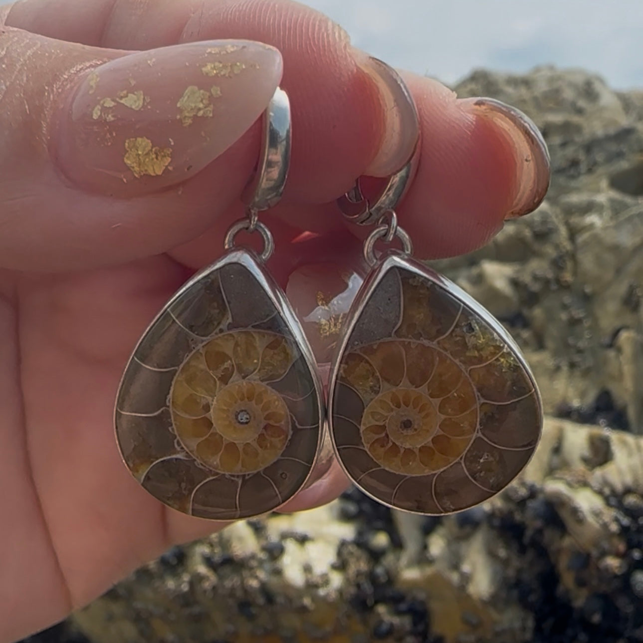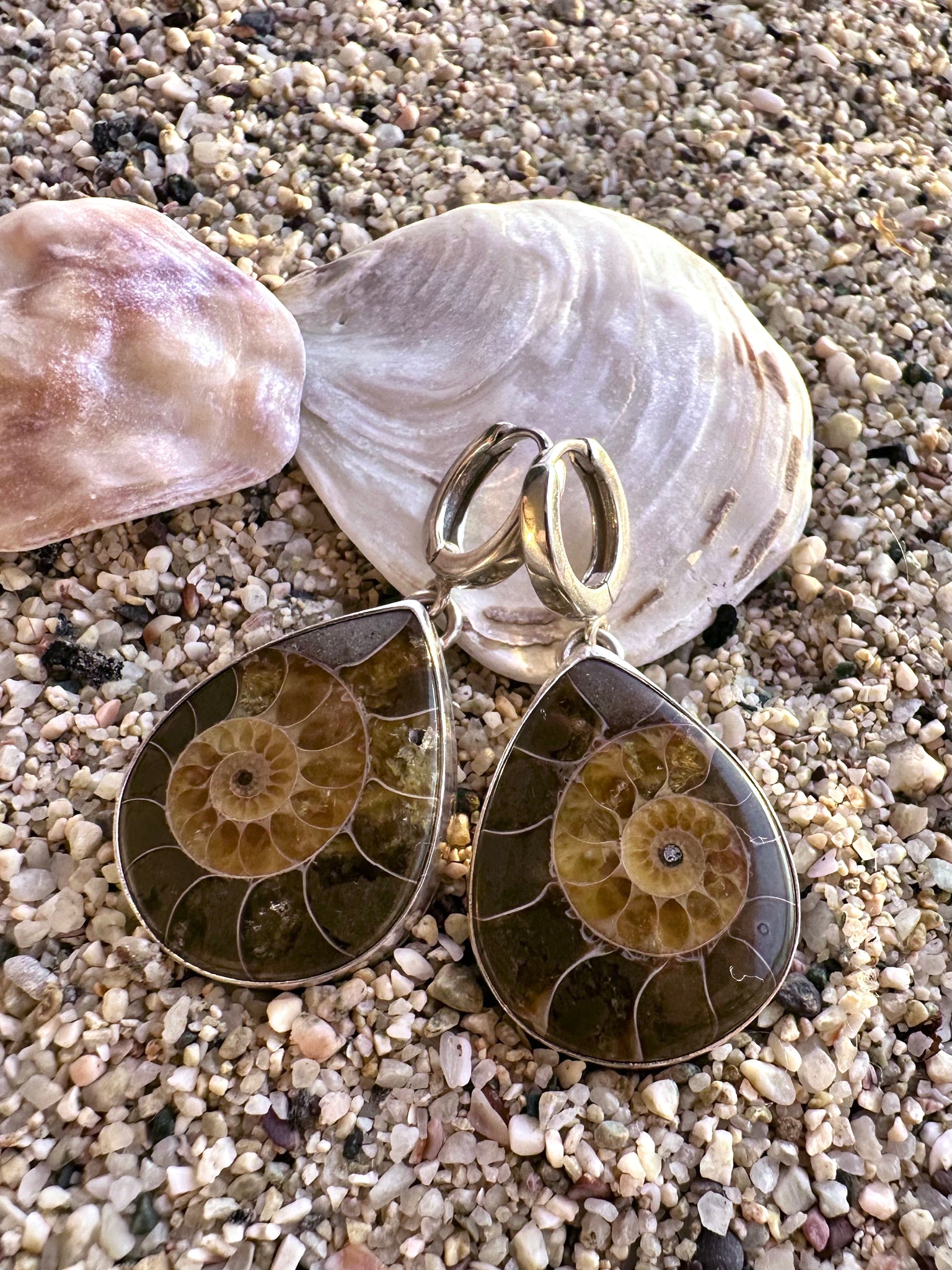 Ammonite shell fossils set in solid sterling silver w/ huggie hoops.