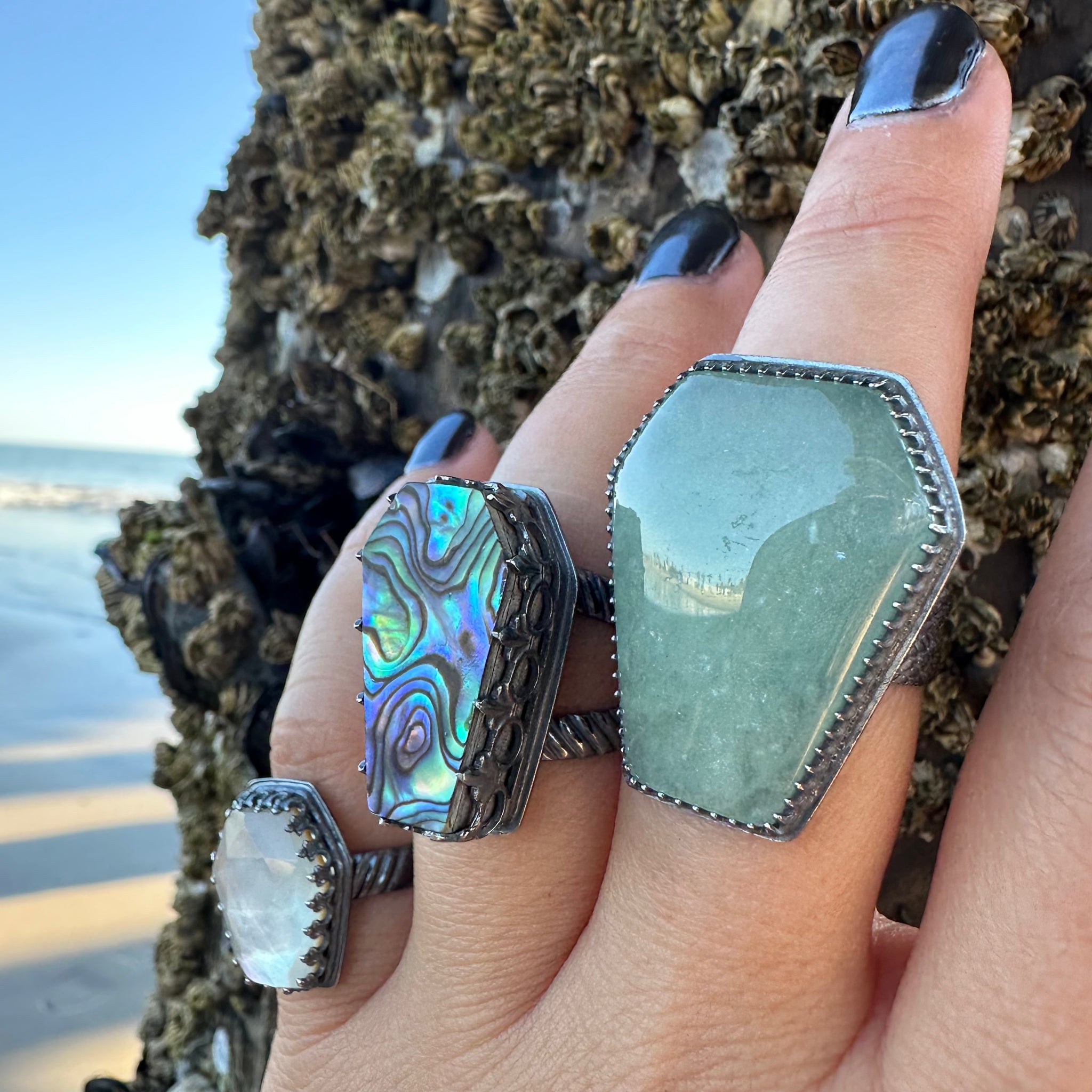 Gun metal finish Solid Sterling Silver Ring featuring a iridescent Mother of Pearl/Quartz Doublet Coffin with a scales pattern band that fits a ring size 8
